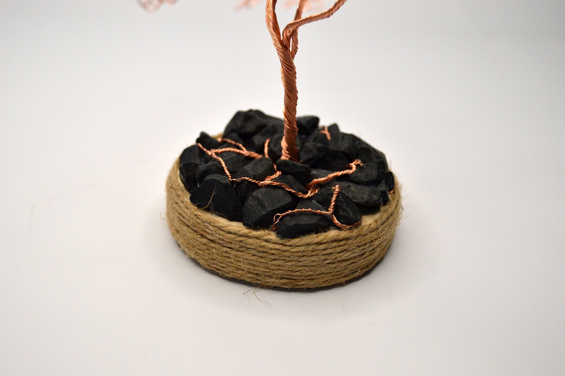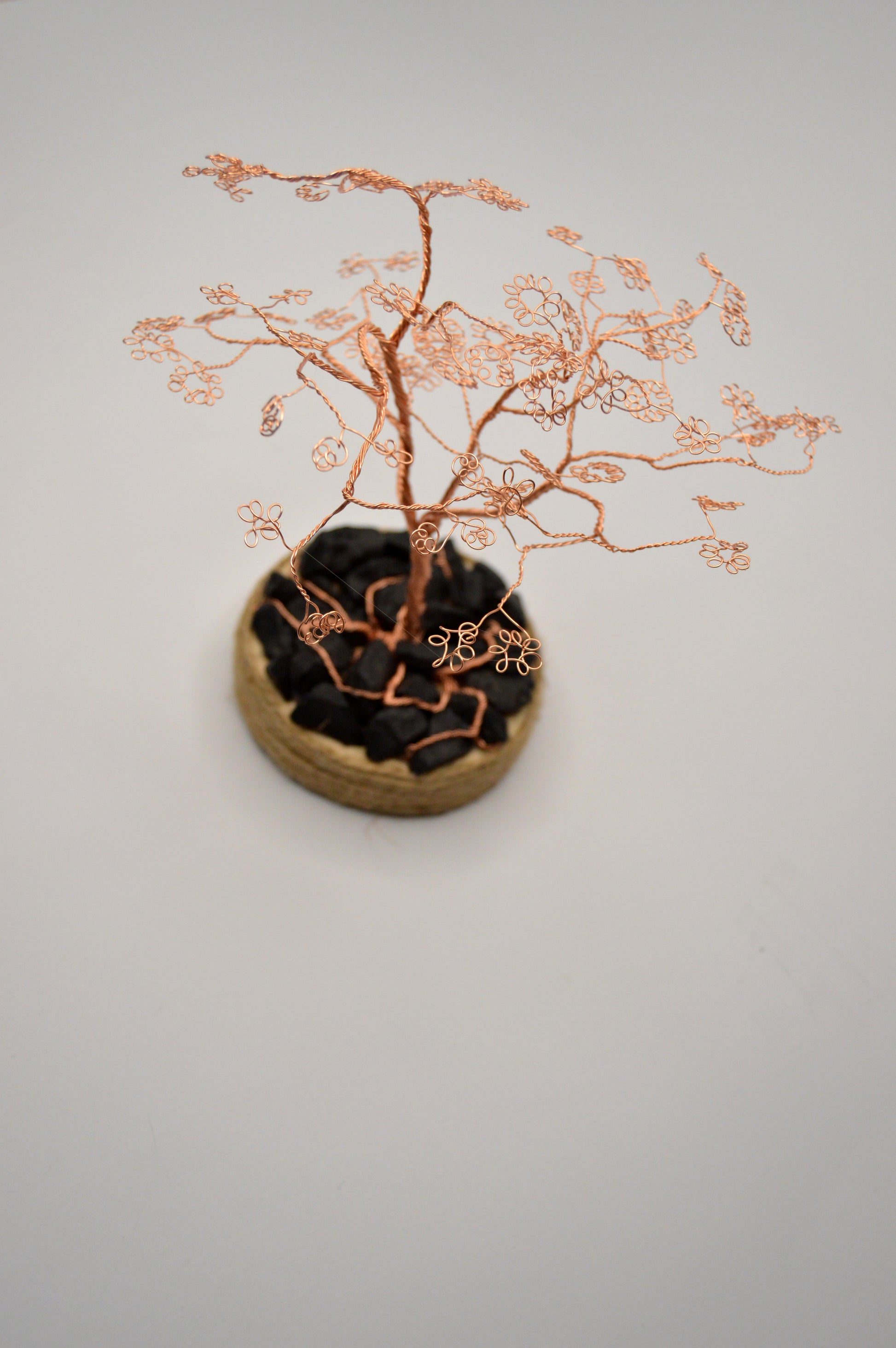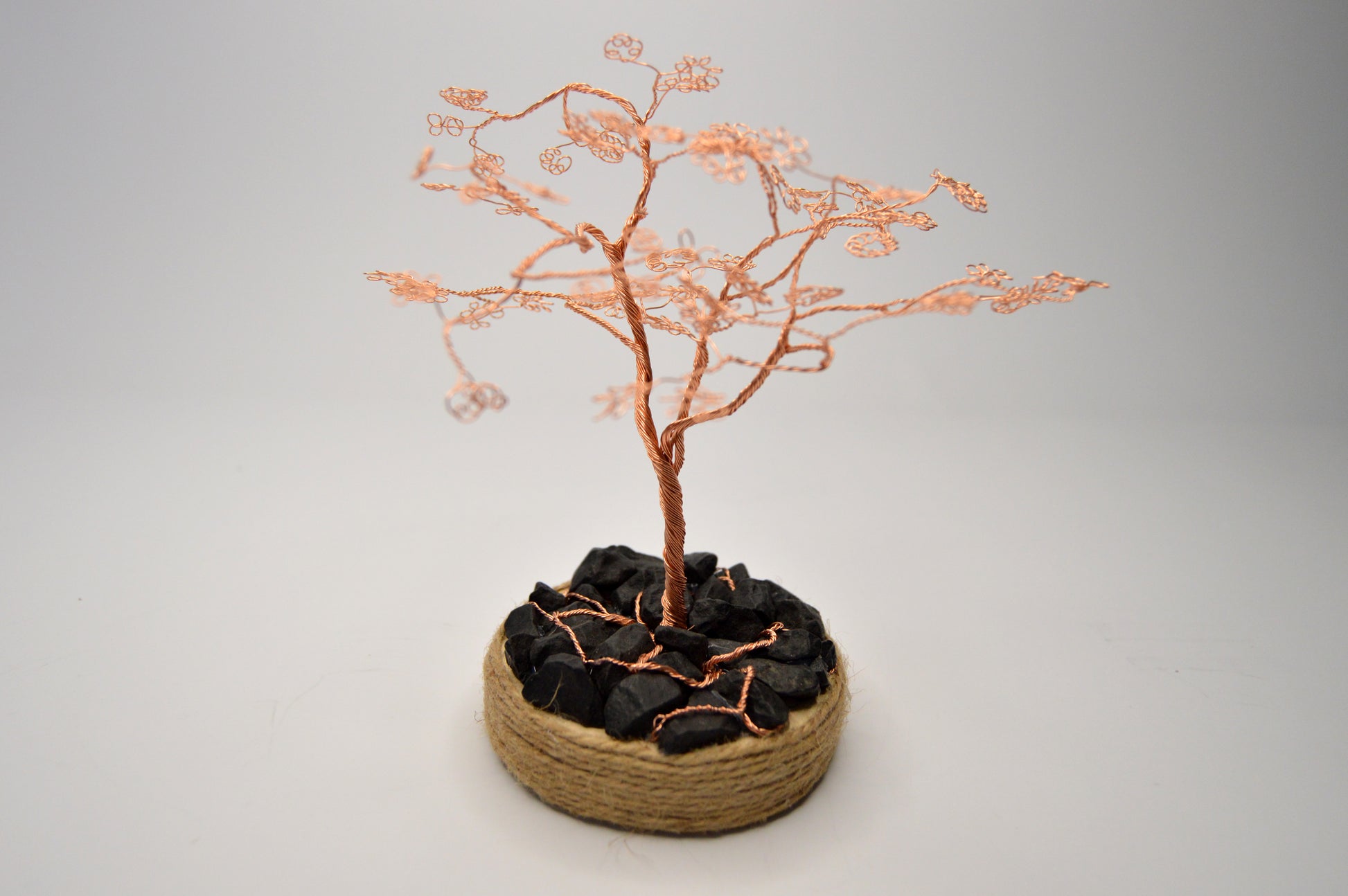 „Copacul Armoniei” este o piesă decorativă unicat, realizată manual din sârmă de cupru modelată cu atenție, cu rădăcini care se contopesc armonios cu o bază naturală formată din pietre negre și sfoară împletită. Ramurile sale fine îți dau impresia unei mișcări ușoare, ca o adiere caldă de primăvară.