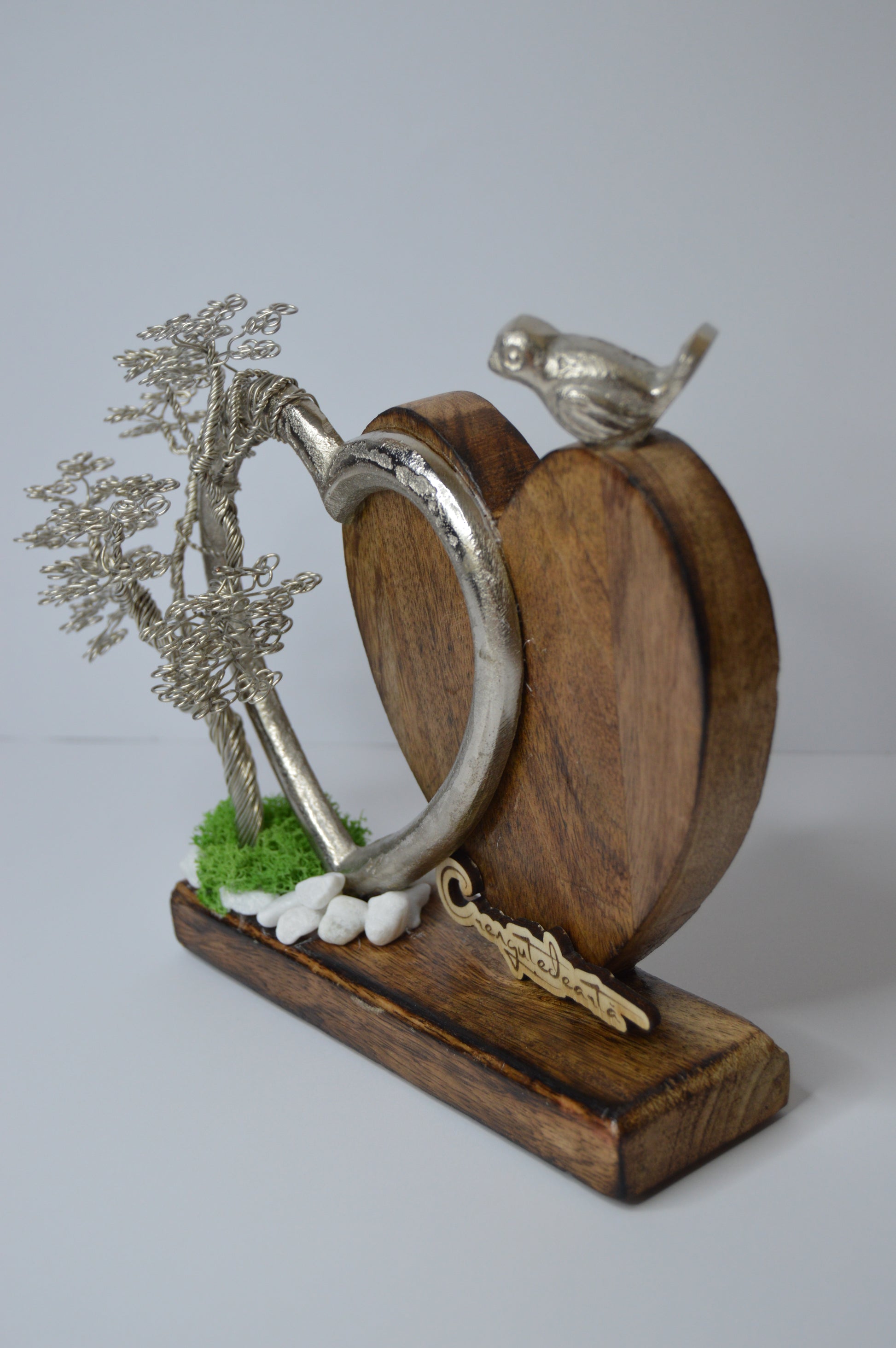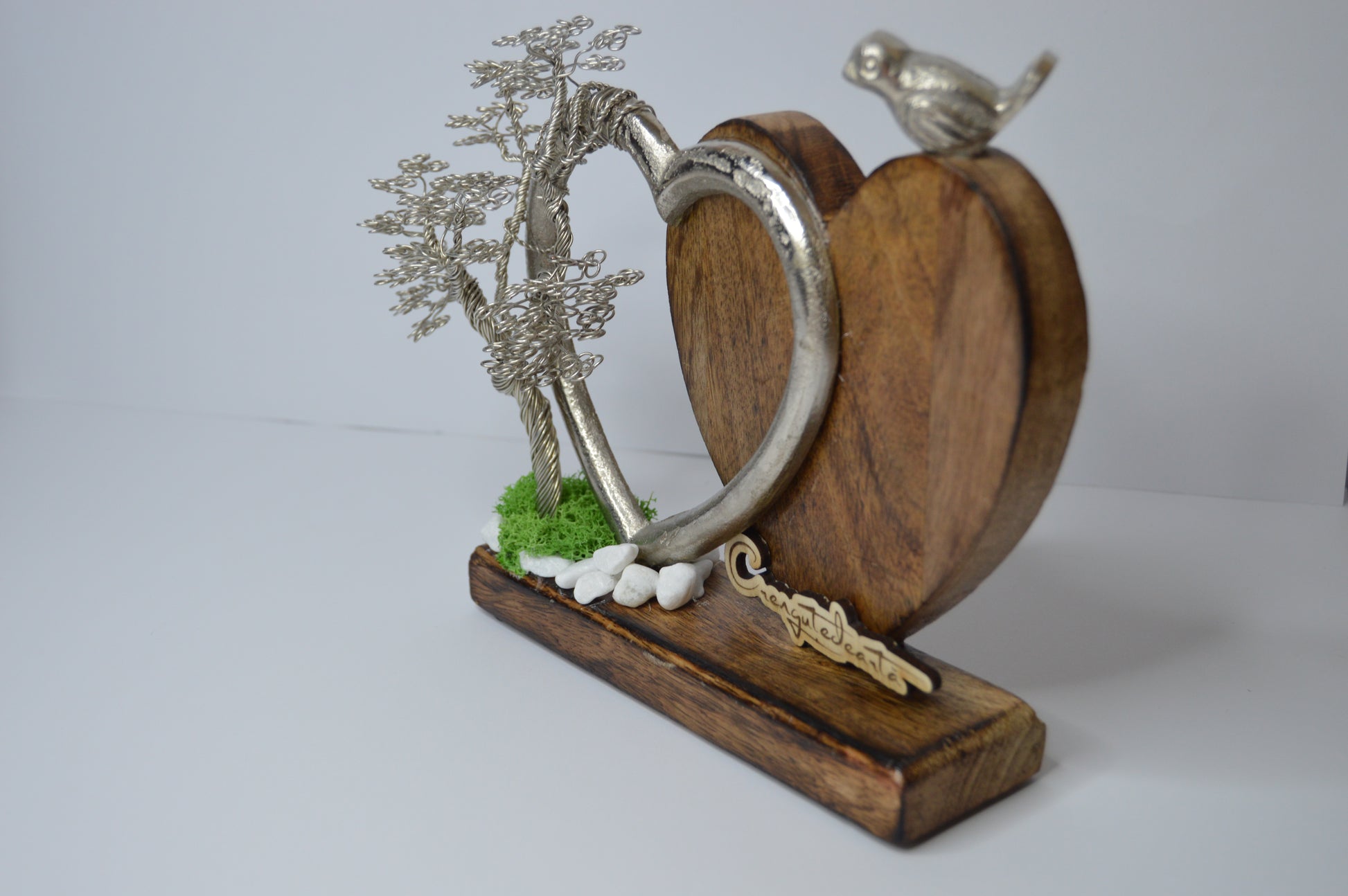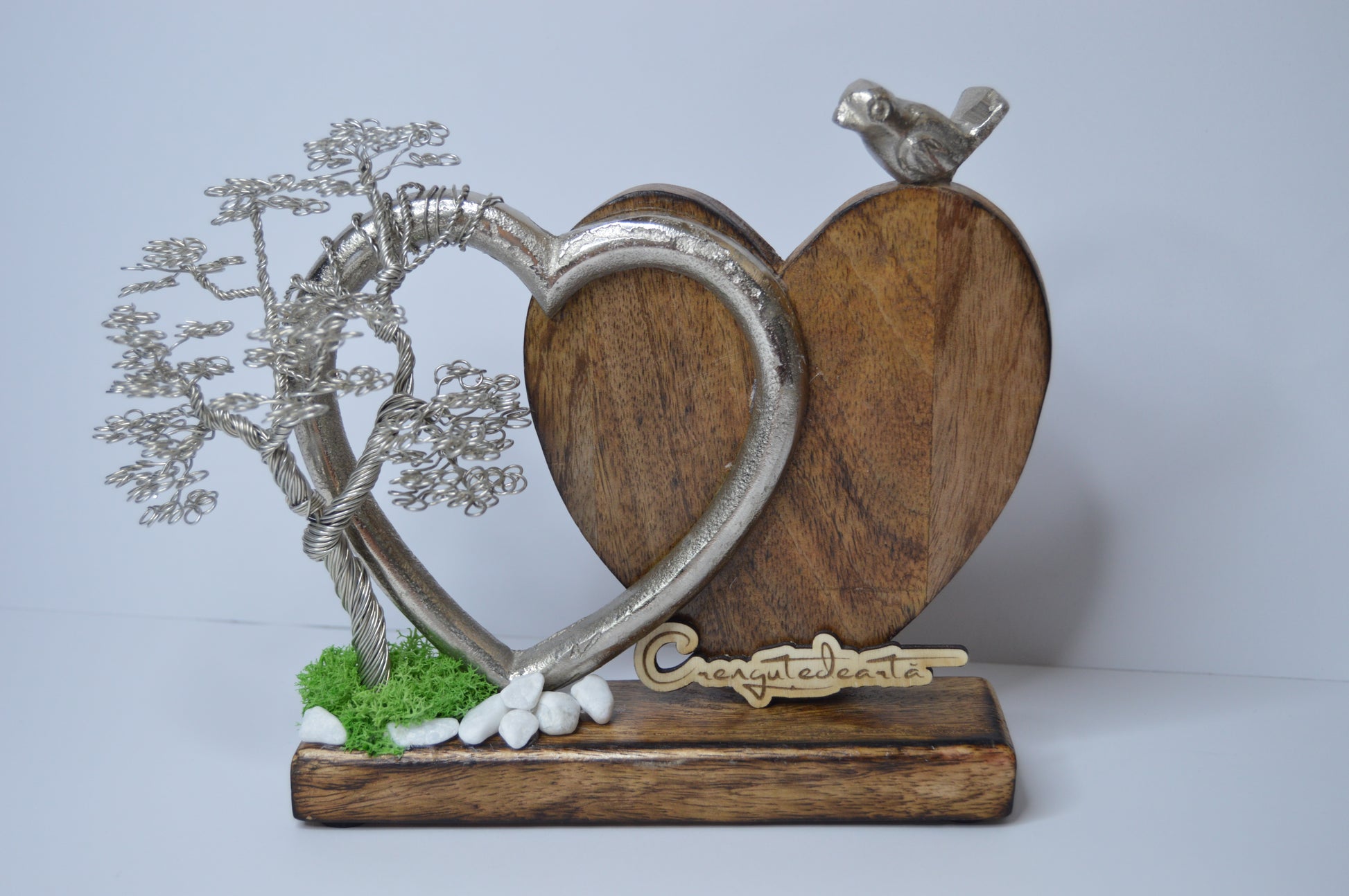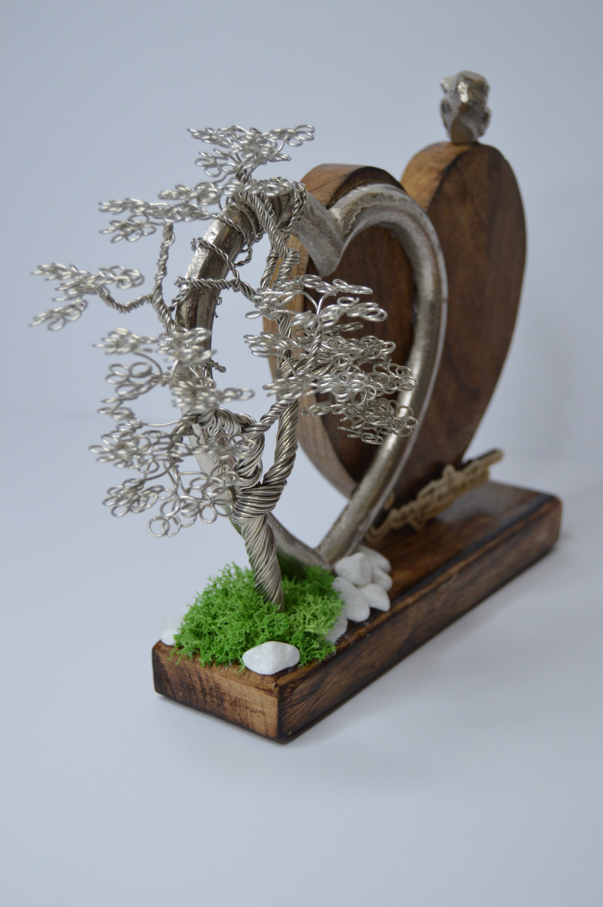 🪵 Materiale: Sârmă de aluminiu argintie, lemn natural de fag, inimă metalică decorativă, pietre decorative, mușchi stabilizat